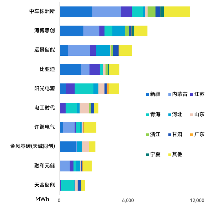 图:2024年新增并网规模排名前十位的储能系统集成商及其主要供货区域