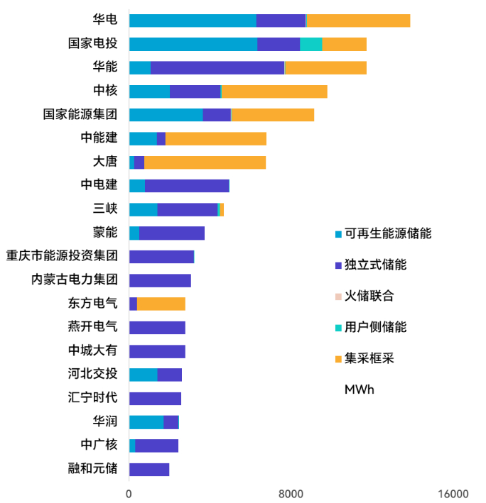 2024年共有294家业主/开发商完成了储能设备采招工作。其中华电落地的采招规模最大,达到了13.9GWh,落地规模超过1GWh的业主共有44家。
