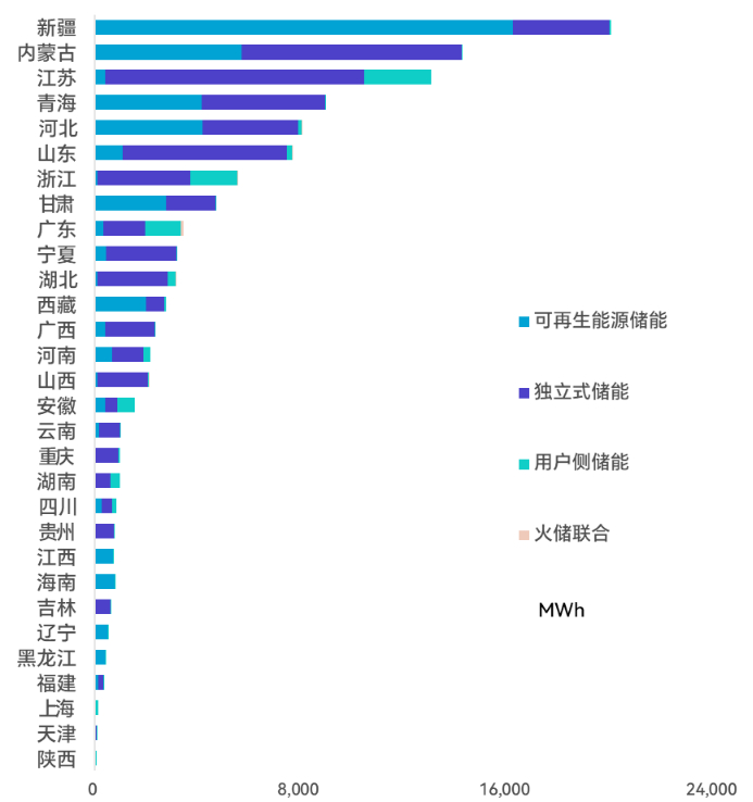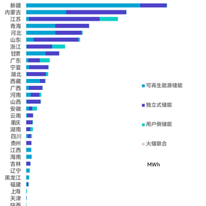 30个省市自治区实现了新增储能项目并网,在新疆、内蒙古领衔下,共17个地区新增并网规模超过1GWh。