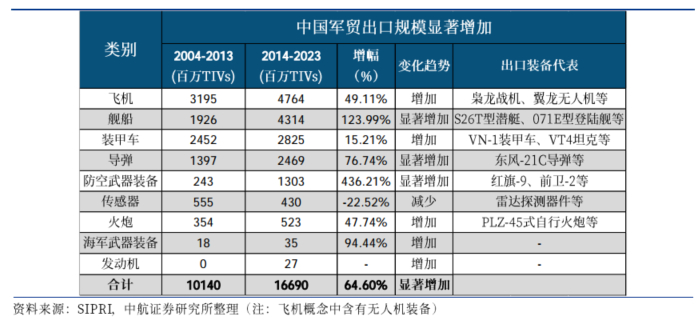 从十年周期的维度来看,根据SIPRI数据,中国近十年(2014-2023年)的军贸出口166.90亿TIV,相较于上一个十年(2004-2013年)的军贸出口(101.40亿TIV)增长64.60%,增长显著。从细分领域上来看,防空武器装备、导弹等防务装备出口趋势明显增加。