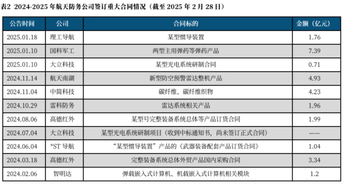 2025年以来,多家航天防务领域中上游上市公司披露了新签订单情况,如下图表所示。显示出航天防务板块部分订单有所落地,业绩有望兑现在2025年的利润表中。