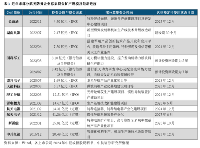 在产能建设方面,近年来,航天防务产业多个上市公司通过IPO或定增等方式,募集资金投向航天防务配套产品的产业化项目或技改扩产项目,我们统计了航天防务企业产业上市公司相关业务扩产情况。可以明显看出,多个上市公司的扩产均在2025年完成,之后将迎来产能爬坡期,我们预计2025年多个航天防务企业将陆续扩产结束并进入产能爬坡阶段,产能峰值或将在“十四五”末甚至“十五五”初完成,在产能峰值之前,下游需求无忧之际,多数企业在中长期上收入与净利润均有望维持高速增长态势。