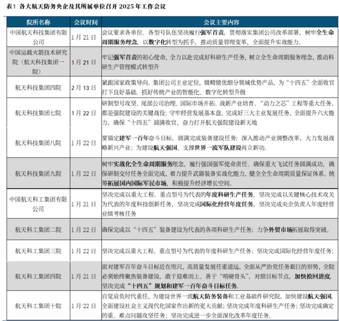 2025年初,包括航天科技、航天科工、兵器工业以及兵器装备等军工央企及其多家所属航天防务业务相关单位召开2025年型号工作会议。从会议内容来看,作为航天防务产业链中下游多个细分板块的“链长”,过个单位在2025年型号工作会中均强调“履行强军首责,树牢全生命周期服务理念,加强创新,推进数字化转型”,同时多数单位提出加强成本管控,具体情况详见下表。