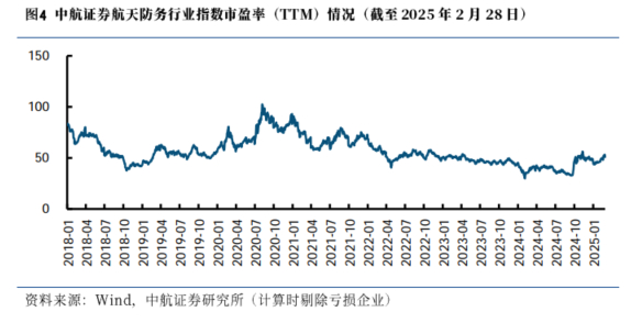 我们对中航证券航天防务行业指数标的进行PE(TTM)统计,截至2025年2月28日,指数市盈率为50.76倍,较2024年底提升3.75,处于2018年以来的36.18%分位,整体估值水平尽管有所提升,但仍处于历史较低位置。