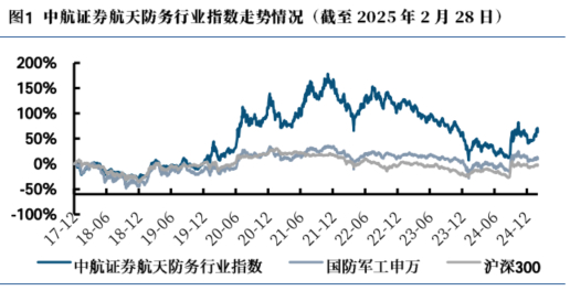 事件:2025年1-2月,中航证券航天防务行业指数涨幅达到7.71%,跑赢军工(申万)指数超过10个百分点,估值较2024年底有所修复。