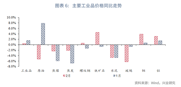 工业品价格方面,受节假日生产淡季影响,PPI同比录得-2.2%,读数较上月回升0.1个百分点,降幅连续四个月收窄。春节后为工业生产淡季,多数建筑项目停工影响建材需求,黑色金属冶炼和压延加工业价格同比下降10.6%,非金属矿物制品业价格同比下降3.5%。