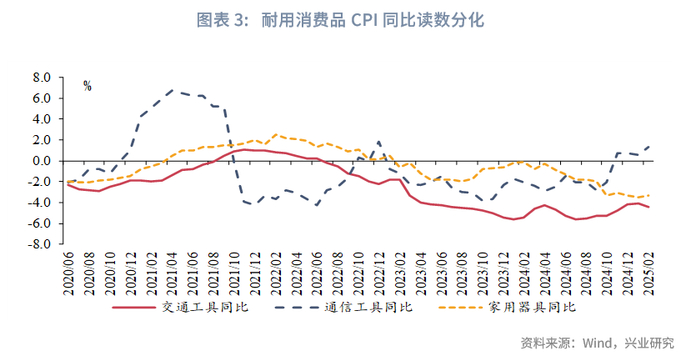 耐用品价格同比读数分化。一方面,通信工具同比上升0.7个百分点,录得1.3%,连续四个月保持正增长;家用器具同比读数回升0.2个百分点至-3.3%,或因以旧换新拉动相关需求、而优惠折扣未能完全在CPI统计口径中体现。另一方面,交通工具CPI同比读数回落0.3个百分点至-4.4%,换新动力略显不足。