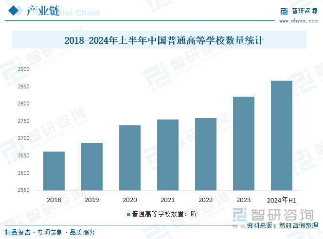 高等教育发展水平是一个国家发展水平和发展潜力的重要标志。当前,我国已建成世界最大规模高等教育体系。据统计,2023年,我国普通高等学校数量从2018年的2663所增加到2822所,截止2024年上半年,我国普通高等学校数量为2868所。