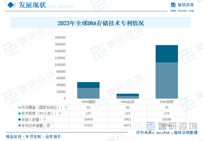 内容概要:DNA存储技术是指用人工合成的脱氧核苷酸链对文档、图片和音频等信息进行存储并能完整读取的技术。DNA作为一种潜在的存储介质,因其耐久性、大存储容量以及高体积密度而引起了人们的研究关注。近年来,全球DNA测序技术研发热度持续上升,2023年全球DNA测序技术专利申请总量为107353项,申请人数量50589个;DNA编码专利申请总量为32535项,申请人数量16459个;DNA合成专利总申请量8471项,申请人数量5951个。中国在DNA存储技术研发方面也表现出强劲的热度,国家层面的政策扶持是推动DNA存储系统行业发展的关键因素。与国外不同的是,在DNA测序、DNA合成、DNA编解码三个领域,DNA合成技术为中国DNA存储企业布局的重点。2021-2023年期间,我国DNA合成事件占据DNA存储技术投资事件的50%,DNA测序占38%,DNA编码占12%。