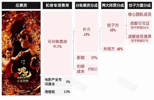 在扣除这些必要开支后,片方净利润约为 49.5 亿。此时,光线传媒作为主要出品方,凭借约 60%的占股比例,能够从中拿走约 29.7 亿;饺子导演所关联的两家公司——可可豆动画、自在境界,合计占股 40%,则可分得 19.8 亿。