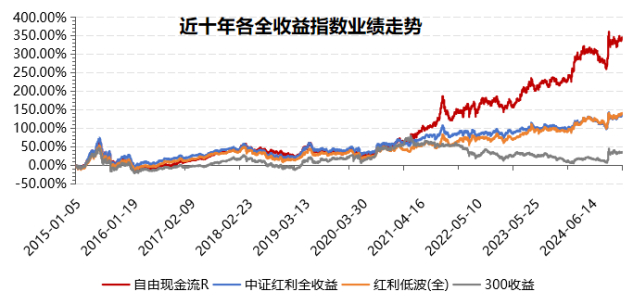 最近关注到华夏基金出了一个ETF基金(自由现金流ETF,代码159201),截至到3月6日,近5天获得连续资金净流入,最高单日获得3.03亿元净流入,合计“吸金”6.72亿元,日均净流入达1.34亿元。份额方面,自由现金流ETF最新份额达13.69亿份,创成立以来新高。规模方面,自由现金流ETF最新规模达13.50亿元,创成立以来新高。该指数基金跟踪国证自由现金流指数(980092),这个指数自2015年以来近十年累计涨幅达363.62%,年化超17%,显著高于中证红利、红利低波和沪深300的全收益指数:
