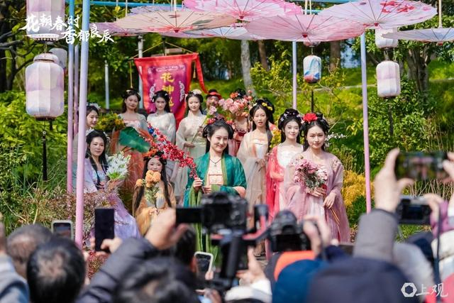 十二“花神”身着华服、点染花钿,仿佛从唐宋画卷里走出来,引得路人频频举着相机合影……首届静安花朝节3月8日在大宁公园开幕,不仅公园里人头攒动,公园隔壁的大宁商圈也人流如织,不少人赏完花直奔商场,很多餐饮店都要排队……