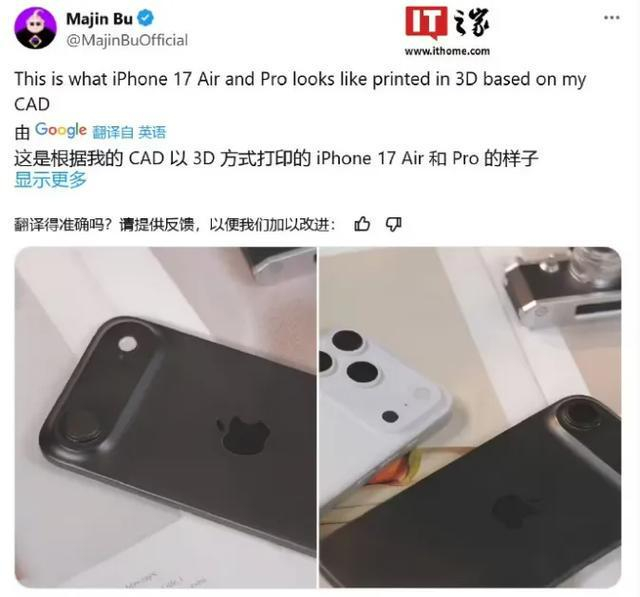 据中国网财经消息,3月9日,消息源@MajinBuOfficial 在X平台发布推文,基于此前分享的CAD渲染图,展示了3D打印出来的iPhone 17 Air和iPhone 17 Pro两款手机机模。
