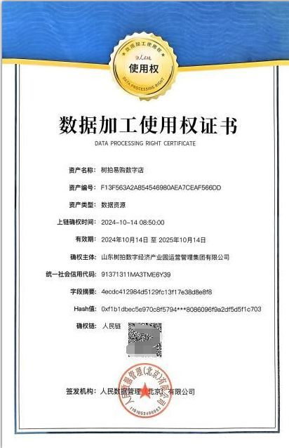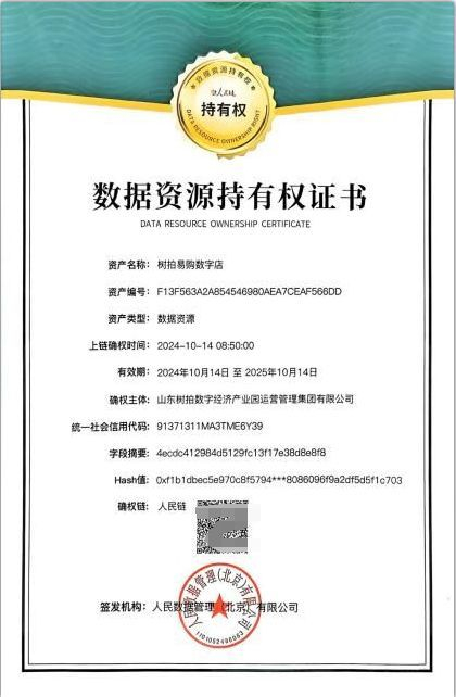 山东树拍数字集团在数据领域实现重大突破,成功斩获人民网・人民数据颁发的《数据资源持有权证书》《数据加工使用权证书》《数据产品经营权证书》,成为罗庄区首家开展数据确权登记的企业。这一里程碑事件意义非凡,它标志着罗庄区企业在数据利用方面从数据资源化到数据资产化迈出了关键一步,为山东树拍数字集团的发展提供了更坚实的数据基础和战略优势。