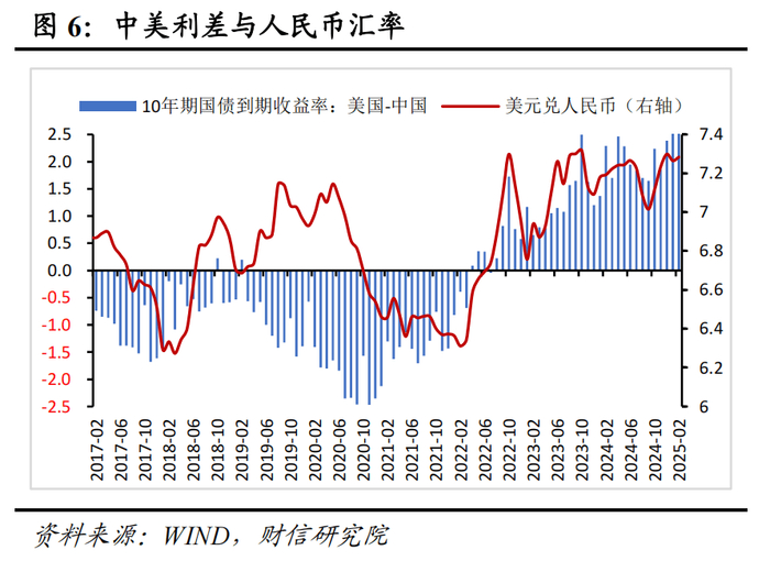 二是尽管人民币汇率贬值压力较大,但央行稳汇率决心较强,预计结售汇逆差在200亿美元左右。从短期看,影响我国企业和居民银行结售汇行为的原因,主要是美元兑人民币汇率的变化。通过比较美元兑人民币汇率与企业居民的银行结售汇差额的历史数据,整体上人民币升值趋势越明显,银行结售汇顺差越大(见图5)。受2025年开年以来美国经济数据持续疲软影响,美债利率持续回落,中美利差倒挂有所收窄(见图6)。但是,由于特朗普加征关税,2025年2月美元兑人民币汇率较1月小幅上升0.3%,与美元指数走弱的走势相悖(见图7),人民币贬值压力较小。综合上述情况,我们预计2025年2月银行结售汇逆差或将收窄,在200亿左右。