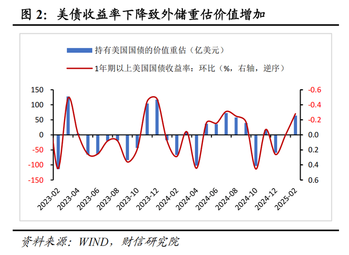一是资产价格变化致外储增加154亿美元。其中,美债收益率下降,债券价格上升,致外储增加64亿美元,加上利息收益有80亿美元,全球金融资产涨跌互现使外储规模增加10亿美元,共使外储增加约154亿美元。2024年12月份我国持有的美国国债7590.16亿美元,约占外储规模的四分之一,美国国债价格变动对我国外汇储备规模具有重要影响。引起美国国债价格变动的主要因素是利率,2025年2月末美国1年期以上国债收益率环比约下降0.28个百分点,美国国债价格上升。预计使我国外汇储备规模增加64美元(见图2)。此外,2025年2月份美国国债的应计利息收入预计在80亿美元左右;两项相加,共导致外储增加约144亿美元。同时,受全球金融资产价格涨跌互现影响,央行持有的其他全球性金融资产规模与上月持平,预计使外汇储备增加约10亿美元。