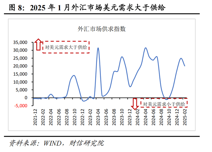 三是外汇市场对美元需求大于供给。从跨境资金流动看,2025年2月份外汇市场的高频监测指标显示,国内外汇市场对美元需求大于供给(见图8)。预计2025年2月份包括非金融类对外直接投资、央行为满足市场主体用汇需求等在内的外汇储备规模损耗在18亿美元左右。