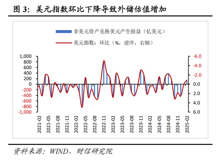 二是美元指数下降,非美元货币相对美元升值,汇率折算造成的汇兑收益约140亿美元。2025年1月末、2月末美元指数分别为108.52和107.56,环比下降0.88%。通过估算,2025年2月份美元贬值导致非美元资产兑换为美元时产生汇兑收益约140亿美元左右(见图3)。