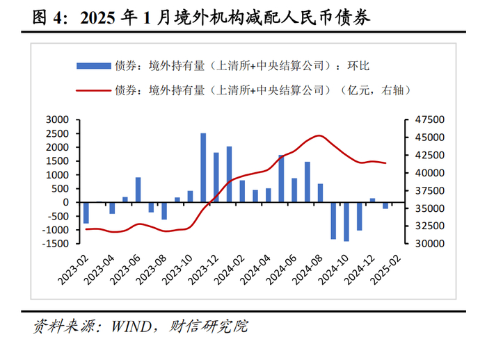 一是预计2025年2月份境外机构配置人民币资产规模增加70亿美元左右。受DeepSeek掀起的算力革命成功带动中国科技资产重估影响,2月市场交易持续活跃,境外机构持续交易人民币资产,引发外储规模变动。对于债券的配置,受股债跷跷板效应影响,债市持续震荡回调,1月境外机构托管债券面额环比减少232亿元,折合31.9亿美元(见图4),预计2月境外机构将继续减持债券。在股市投资方面,由于2025年2月份我国A股市场放量上涨,预计外资大幅流入。结合债券与股市的走势情况,预计境外机构资产配置效应使2025年2月份外储增加70亿美元左右。