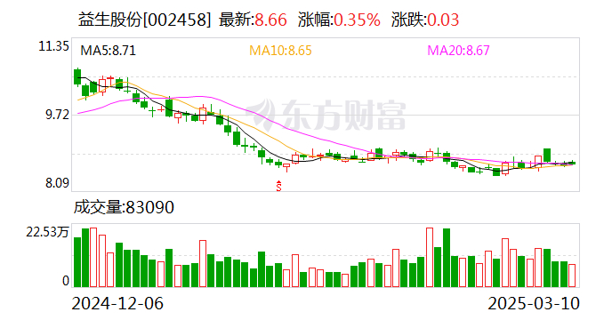 3月10日,益生股份(002458)发布公告,2025年2月份的销售情况显示,鸡苗销售数量为5231万只,销售收入为1.24亿元,同比变动为20.11%和-40.3%,环比变动为-3.7%和-14.93%。