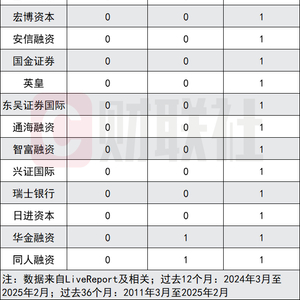 在过去12个月(2024年3月至2025年2月),中金公司、中信证券、华泰国际在港股IPO业务方面表现突出,上市数量分别为19单、12单、9单,在这期间的74家港股IPO中,三家合计占比达54.05%,其中仅中金公司一家占比就达25.68%。