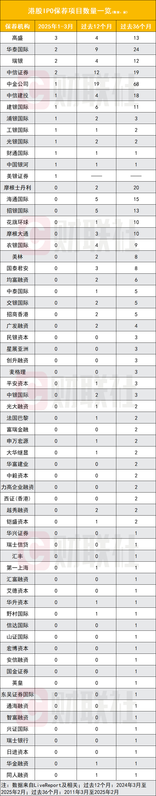 过去12个月(2024年3月至2025年2月),74家港股IPO上市,38家保荐机构参与保荐。项目数量最多的保荐机构是中金公司(19单);此外,中信证券有12单,华泰国际有9单,建银国际有6单,海通国际、招银国际各有5单,中信建投、高盛、瑞银、农银国际各有4单。