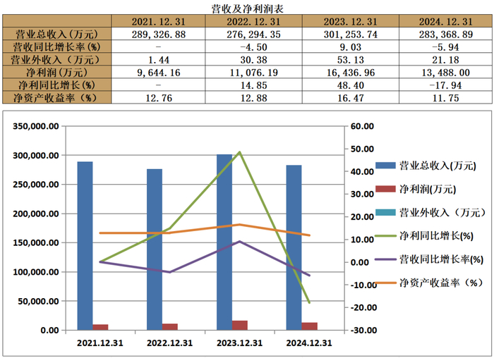 业绩情况:2021-2024年底,公司的营业收入分别为289,326.88万元、276,294.35万元、301,253.74万元、283,368.89万元,年均复合增长率为-0.52%;归母净利润分别为9,644.16万元、11,076.19万元、16,436.96万、13,488.00万元,年均复合增长率为8.75%。