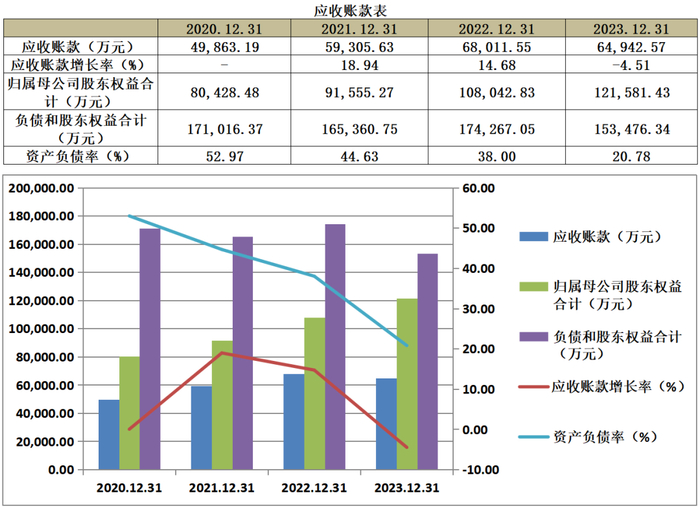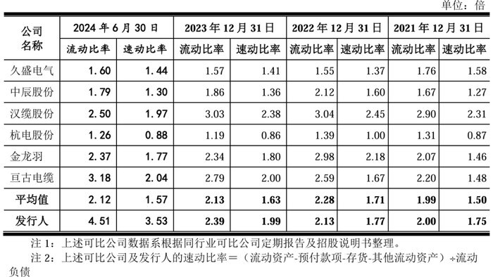 2021年至2023年,公司流动比率和速动比率波动较小,且与同行业可比公司平均值接近;2024年上半年,公司流动比率和速动比率提高,且显著高于同行业平均水平,主要系公司根据运营资金需求减少了短期借款和票据支付的金额,使流动负债减少所致。
