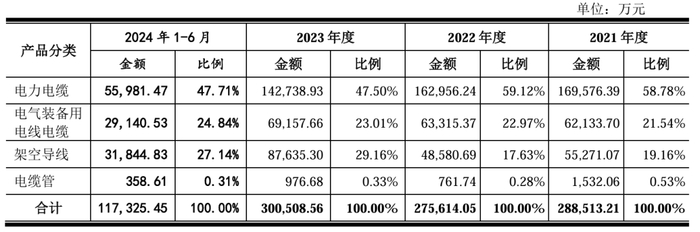 公司主要产品涉及产品大类为:电力电缆、裸电线和电气装备用电线电缆。