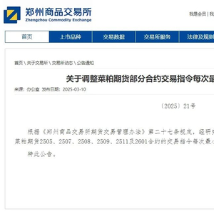 今日(3月10日),郑商所发布了公告《关于调整菜粕期货部分合约交易指令每次最小开仓下单量的公告》,自2025年3月10日当晚夜盘交易起,菜粕期货2505、2507、2508、2509、2511及2601合约的交易指令每次最小开仓下单量调整为10手。
