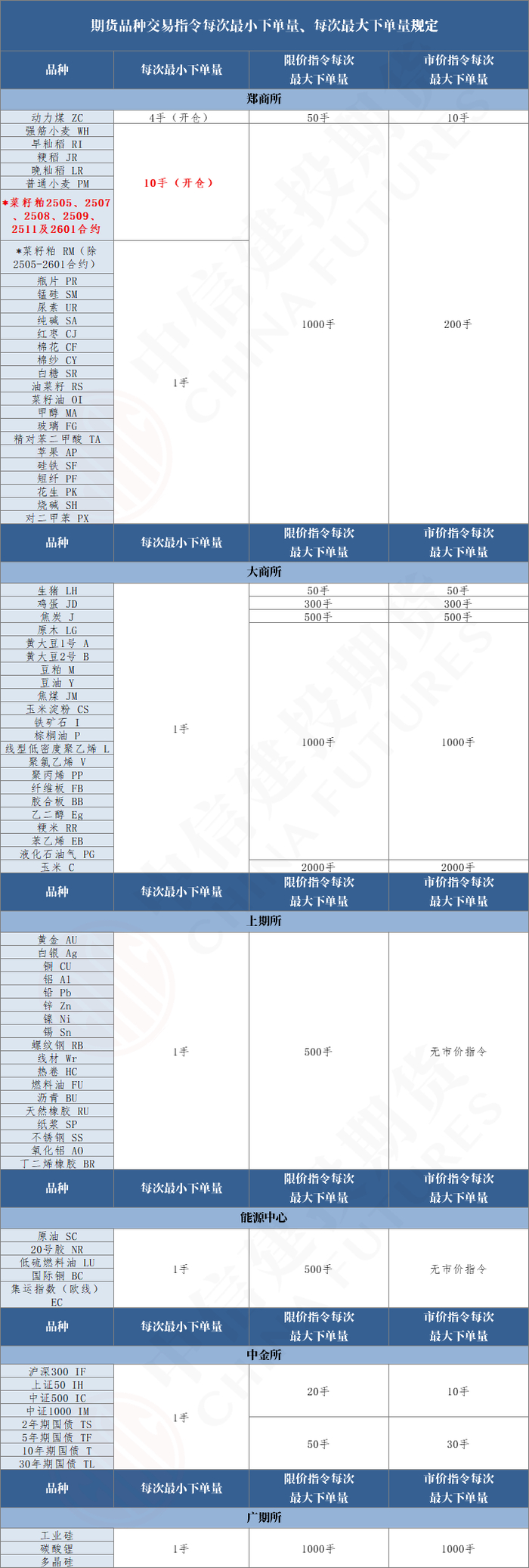 为了交易者大大们更顺利的交易,小编也为大家整理目前期货市场中期货及期权品种交易指令每次最小下单量和每次最大下单量的情况!一篇文章全部告诉您,记得收藏哦!