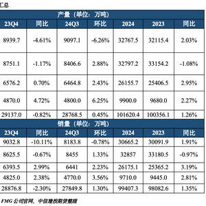 展望2025年,四大矿山产销有小幅增长空间。2024年淡水河谷超额完成预期产量目标,同时2025年产销目标上调至3.25-3.35亿吨。力拓2024年产销小幅下降,但其2025年的发运量目标维持不变,保持3.23-3.28亿吨水平,预计2025年力拓产销基本维持。必和必拓2025财年产量目标2.82-2.94亿吨维持不变,上半财年目标完成度为49.32%,新增项目如期完成产能提升,交付量创下历史新高,很大程度弥补老矿区衰竭的缺口,预计下半财年能如期完成财年目标。FMG在2024财年低位完成1.92-1.97亿吨的指导目标,并将2025财年指导目标调整为1.9-2亿吨,目前上半财年目标完成度为48.5%。