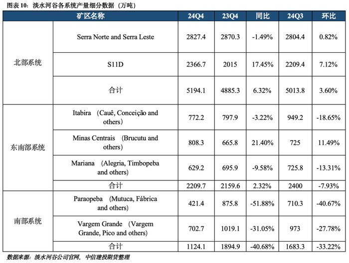 北部系统:S11D矿区创产量新高。四季度北部系统产量5194.1万吨,同比增加6.32%,环比增加3.60%。S11D矿区产量2366.7万吨,同比增长17.45%,环比增长7.12%,创下四季度产量记录。Serra Norte和Serra Leste矿区产量2827.4万吨,同比下降1.49%,但环比增长0.82%。北部系统是三大系统中铁矿产量和品位最高的,但Serra Norte和 Serra Leste两大矿区中长期面临矿山可用性降低的问题,S11D作为近年新增项目之一,由于淡水河谷在2024年优化了自身的维护策略,S1D实现了创纪录的产量,在资产可靠性和运营稳定性方面均有提升,以抵消资源枯竭矿区产量下降的可能。此外,Serra Norte和Serra Leste矿区的生产符合预期目标。