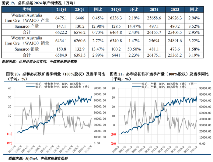 2024年(2024财年Q3Q4及2025财年Q1Q2)铁矿石权益产量26155.7万吨(100%权益28956.8万吨),同比增加3.19%。铁矿石权益销量为26175.1万吨,同比增加3.19%。