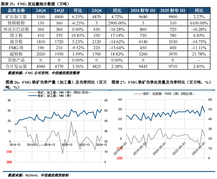 FMG 2024年运营业绩强劲,采矿、加工和运输增长明显,2025年有望继续增长。2024年FMG铁矿石产量(铁矿石加工量Ore Processed)为9900万吨,同比增加2.27%;发运量为9710万吨,同比增加2.81%。铁桥项目预计将在2025年达到满负荷生产状态,为FMG铁矿业务提供增量。