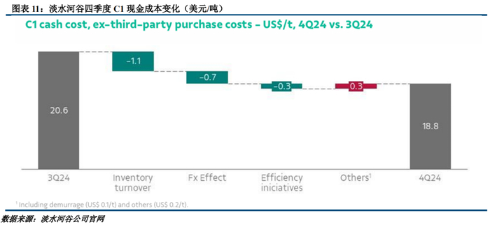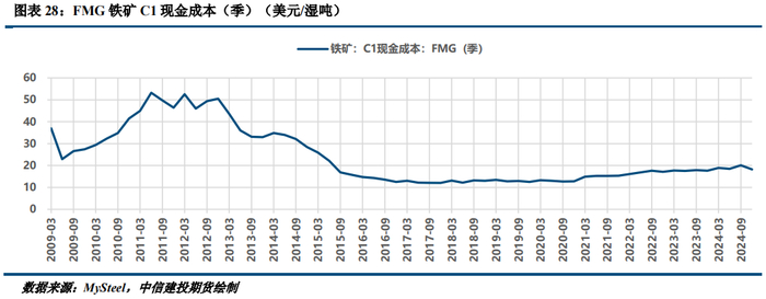 成本方面,FMG 保持较大优势。四季度,皮尔巴拉赤铁矿 C1 成本为 18.24 元/湿吨,较三季度环比下降 9.52%。2025 财年上半 C1 成本为 19.2 美元/湿吨,靠近指导区间中值。2025 财年的 C1 成本指导目标为 18.50-19.75 美元/湿吨,比 2024 财年提高 0.5-0.75/湿吨。