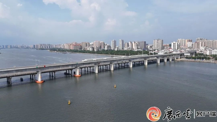 2023年全国首条直通中越边境城市的防东铁路建成通车。图为动车通过防城港跨海大桥一幕。
