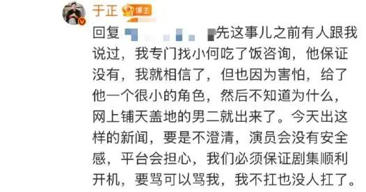 于正还在评论区回复:这事儿之前有人跟我说过,我专门找小何吃了饭咨询,他保证没有,我就相信了,但也因为害怕,给了他一个很小的角色。今天出这样的新闻,要是不澄清,演员会没有安全感,平台会担心,我们必须保证剧集顺利开机,要骂可以骂我,我不扛也没人扛了。