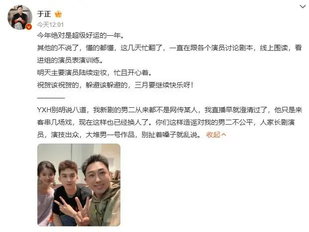 随后,于正发博澄清,他只是来客串几场戏,现在这样也已经换人了,并且他从来都不是新剧的男二。