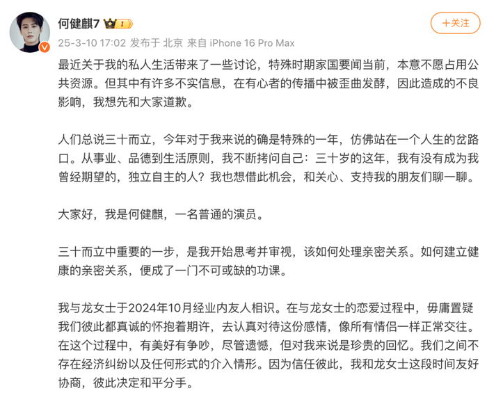 10日下午,短剧演员何健麒发文回应“劈腿传闻”,称与龙女士之间不存在经济纠纷以及任何形式的介入情形,和龙女士这段时间友好协商,彼此决定和平分手。