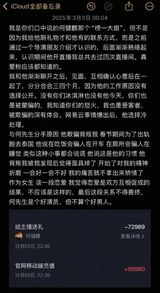 之前报道,有账号发文爆料男演员何健麒出轨。该账号自称是何健麒直播间“榜一大姐”,并晒出近15万元的直播打赏记录以及照片作为证据。