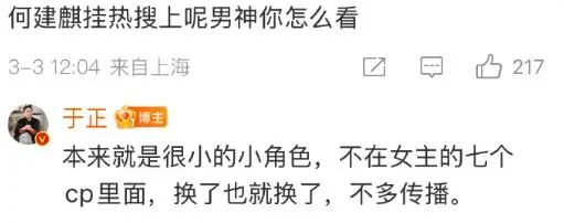 今天中午,有网友在知名导演于正微博下评论关于何健麒相关问题,于正表示原定由其参演的新剧《玉茗茶骨》(侯明昊、古力娜扎主演)已确认换角。于正称其为“很小的男配角色”,并强调该角色“不在女主七个CP之列”,换了就换了。