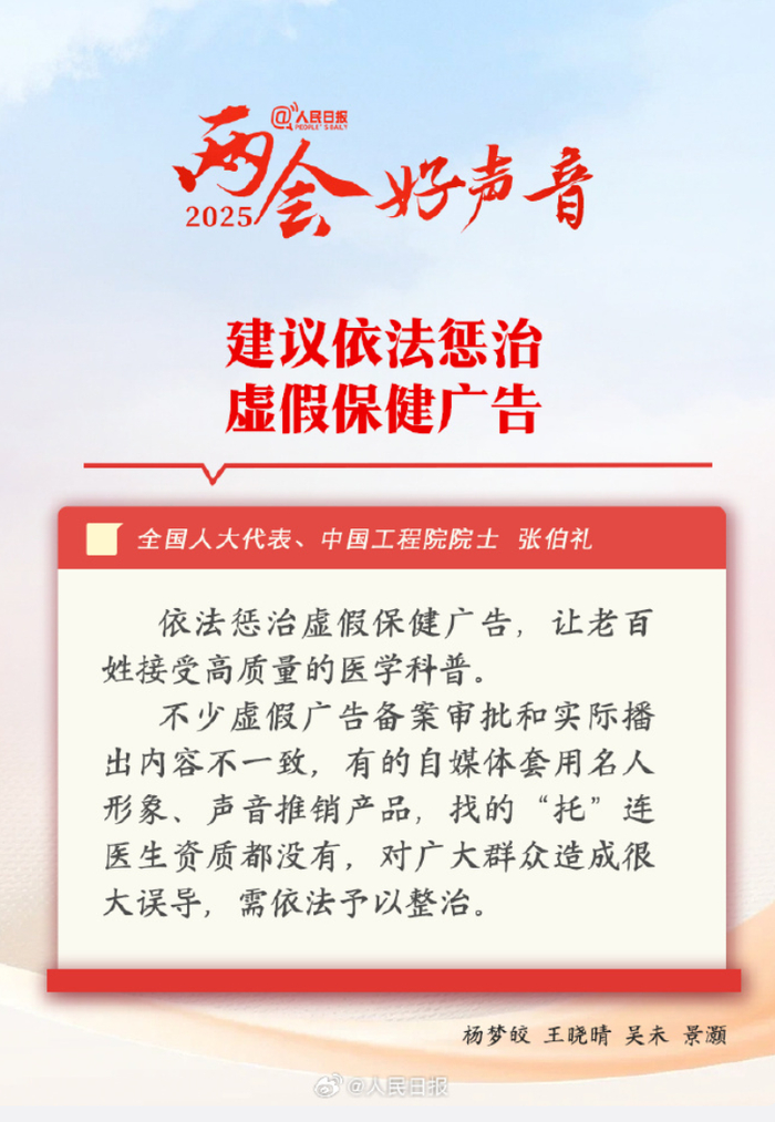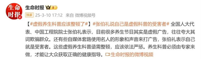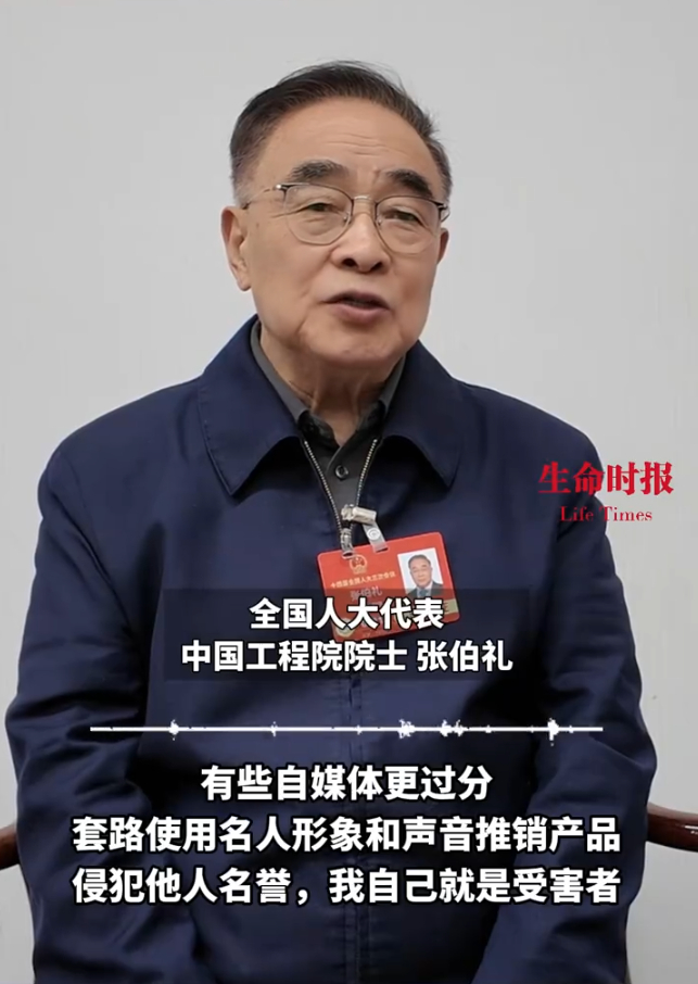 据生命时报,全国人大代表、中国工程院院士张伯礼表示,目前很多养生节目其实是虚假广告,往往夸大其词欺骗群众。还有些自媒体套路使用名人的形象和声音来推销产品,侵犯他人名誉,“我自己就是受害者”。