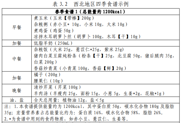 值得注意的是,这份食谱细化到了全国不同地区的食谱示例,并备注了食谱的“总能量”。
