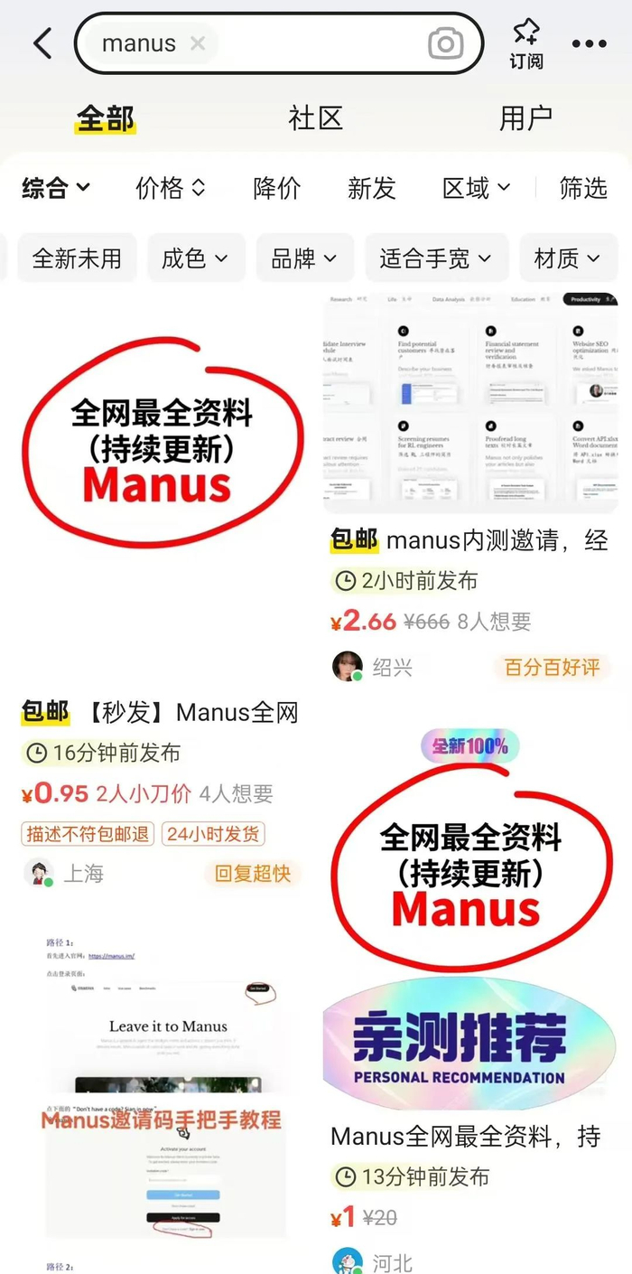 春江水暖,闲鱼先知。全球首款自主AI Agent(智能代理)产品“Manus”一夜爆红,邀请码一度在闲鱼上被炒至6万元;小米新车SU7 Ultra发布后,大量网友在闲鱼上发布加价转卖帖,甚至连配套的不锈钢杯都供不应求;蜜雪冰城IPO前,闲鱼上相关搜索量即刻暴涨;北京SKP的老铺黄金门店热销时,闲鱼“代购党”们应声出动……每一个在闲鱼上出现的热点事件,都代表了市场的明确态度,用户在闲鱼上追踪热点事件和捕捉市场先机,品牌在闲鱼上观察用户行为和喜好,闲鱼已成了洞察市场先机和影响消费趋势的“超一手”平台。