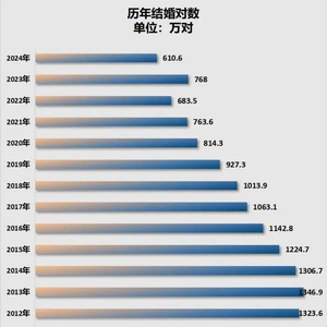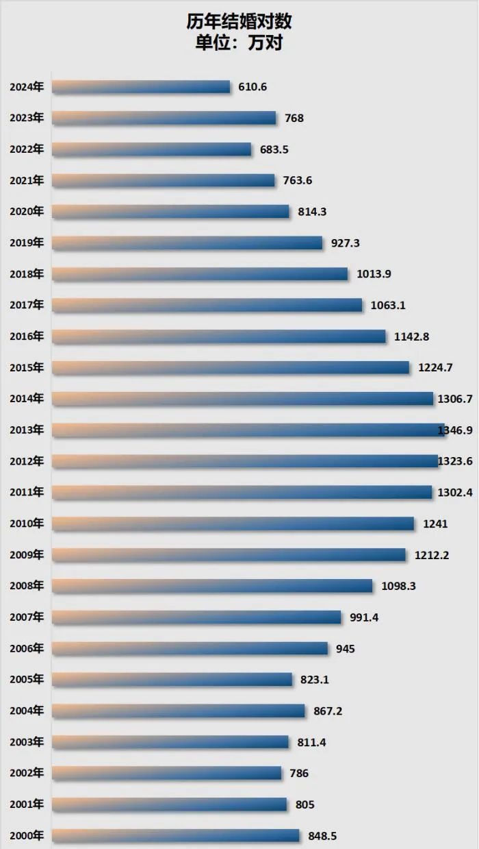 2013年后结婚登记数逐年下降,2019年跌破1000万对。2之后呢继续下降,2022年降至683.5万对。2023年结婚登记数短暂回升至768.2万对。2024年再度下降至610.6万对,为历史最低。