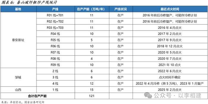 截至2025年2月底,泰玻共有泰安新区、邹城公司以及山西3个生产基地,粗纱产能合计121万吨,电子纱产能合计14万吨。2023年以来公司产能投放趋于稳定,新增产能包括①邹城电子纱5线5改8,2024年1月冷修、2024年11月复产,②山西1线于2025年2月点火。