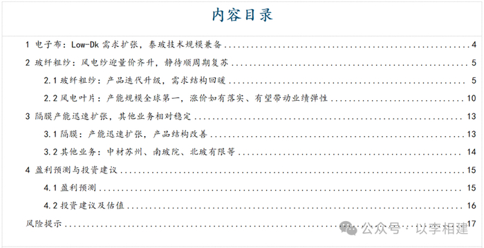 Low-Dk电子布业务可能不及预期;玻纤供需格局变化不及预期;风电叶片盈利能力修复不及预期; 锂膜业务盈利能力继续下滑的风险;原材料价格波动的风险。