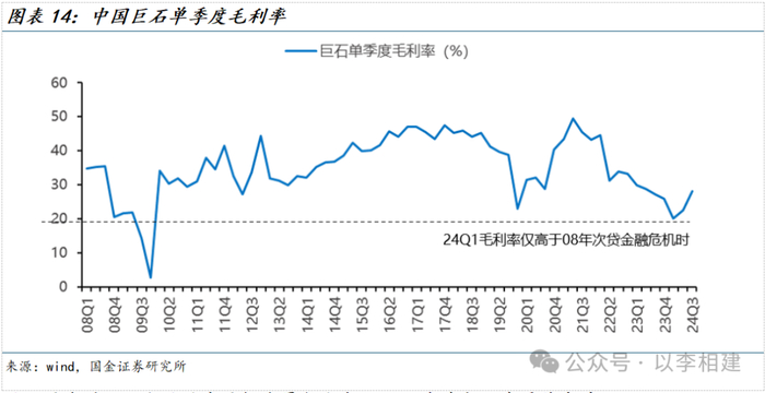 复盘巨石历史毛利率,前期(23Q3-24Q1)行业价格竞争趋势惨烈,24Q1巨石毛利率仅高于08年次贷金融危机时,23Q3-24Q1部分玻纤二三线公司单季度扣非利润均为负值、甚至处于亏损现金流状态。24Q3巨石单季度毛利率28.18%,同比+1.03pct、环比24Q2+5.61pct,较24Q1底部毛利率回升8.05pct,龙头中国巨石粗纱盈利能力环比继续回升,玻纤行业周期底部明确。