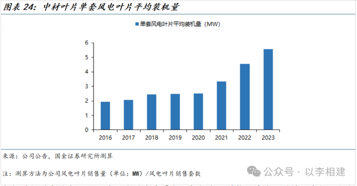 主机大型化和低成本趋势,驱使叶片全面转型为大型化产品,我们测算,2023年公司单套风电叶片平均装机量为5.56MW,而2020-2021年分别仅为2.51、3.33MW,大功率叶片产品迭代明显。大叶型叶片目前主要集中在CR2两家龙头,供给端依然较为紧缺。大叶片方面,中材叶片122米主成型周期突破72小时、122米以上叶型生产效率在行业内处于领先水平,建成5条年产150套120米级别大型海上风电叶片示范生产线,实现13.6-16MW级别全球最长叶片批量化生产。